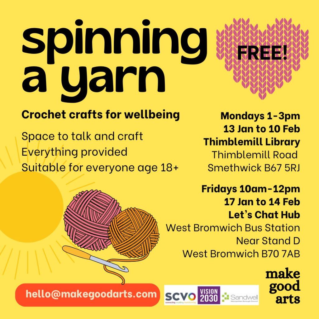 Join us at Thimblemill Library and Let’s Chat Hub in West Bromwich for relaxing crochet and yarn crafts – everything is provided and it’s suitable for complete beginners!