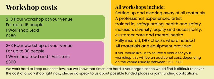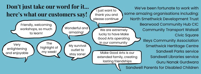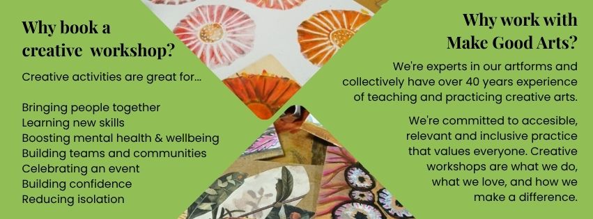 Want to get creative with your community group, team or class? Make Good Arts can create your perfect creative activity, send us a no obligation enquiry today, using the form below, and we’ll get to work making your ideas come to life!