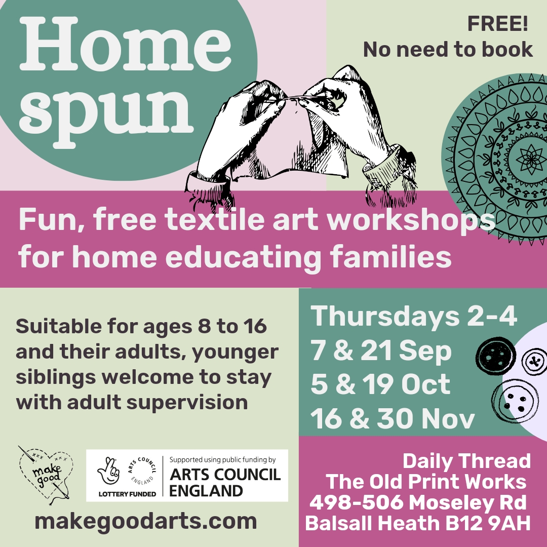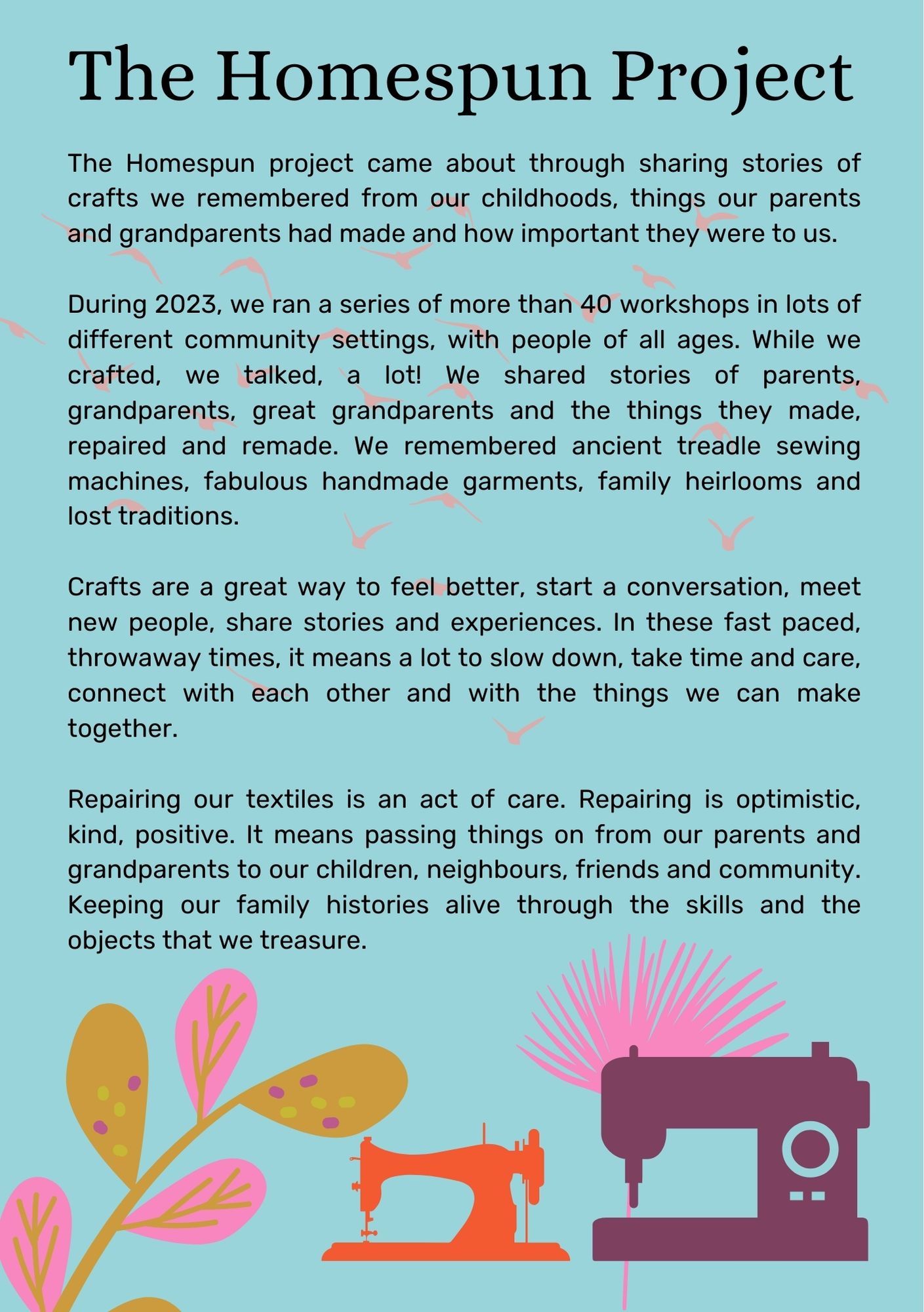 In March 2023 we began our HomeMade project, funded by Arts Council England, with a series of HomeSpun workshops. We shared craft skills and learned new things like weaving, feltmaking and printing.